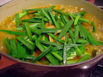 グツグツ煮立ったら火を弱めて少し煮込んで味をととのえ、再び強火にして最後ににらと卵を落として蓋をします。