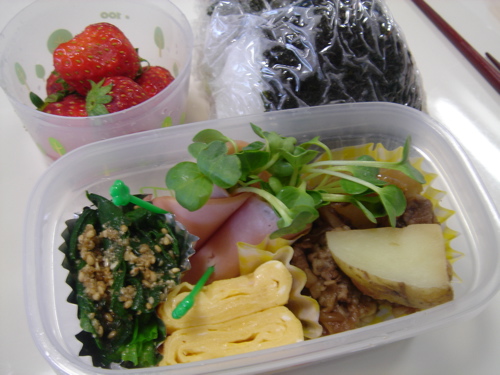 肉じゃがの残り、ハムのかいわれ巻、卵焼き、ほうれん草のごま和え、デザートはいちごです。