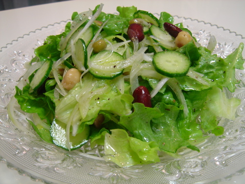 材料はサニーレタス、きゅうり、たまねぎ、お豆(ボイルしてあるもの)。