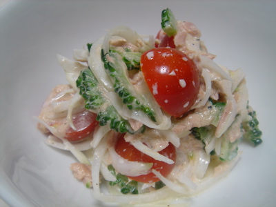 ②ボウルにゴーヤ、ツナ、たまねぎ、プチトマトを入れ、塩コショウをしてかるく混ぜ合わせ、マヨネーズを多めに入れてまぜあわせたらできあがり♪