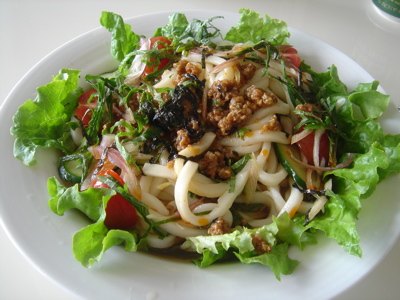 昨日のお昼ご飯は先日つくった肉味噌を使ってサラダうどんを作りました。