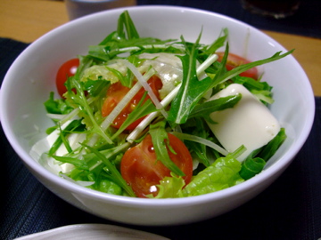 水菜、ミニトマト、お豆腐にドレッシングをかけました。