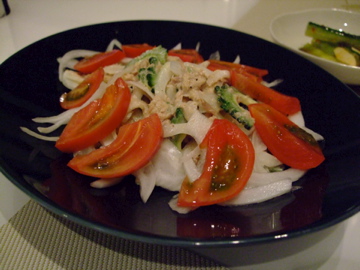 私はゴーヤのレパートリーが少なくて、ゴーヤを買うとチャンプルーかサラダにすることが多いです。これはたまねぎスライス、ツナ、トマトを使ったサラダ。塩こしょう(黒胡椒)とマヨネーズでゴーヤ、ツナ、たまねぎを和えてゴーヤの苦みをやわらげます。