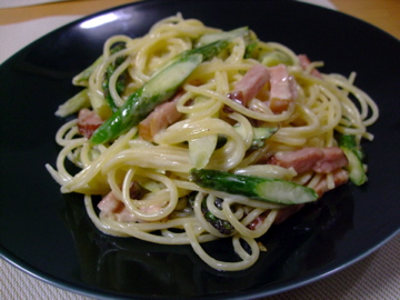 アスパラとベーコンのクリームパスタ。