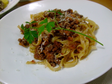 先日のミートソースの残りを、今回はフェットチーネでいただきました。