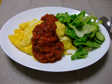 トマト缶とにんにく、たまねぎ、パセリで簡単に作ったトマトソースをかけて、グリーンサラダを添えれば完成です。(トマトソースかけすぎましたが)