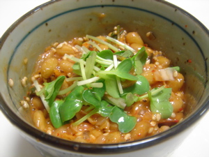 右はキムチ納豆。キムチを入れすぎてちょっと辛くなりました。