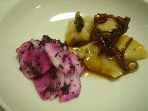 かぶの漬け物は一応自家製です。ゆかりであえたものと、塩昆布と唐辛子であえたものです。