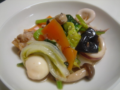 材料はいか、ベビー帆立、白菜、人参、きくらげ、しめじ、ほうれん草、うずらの卵です。