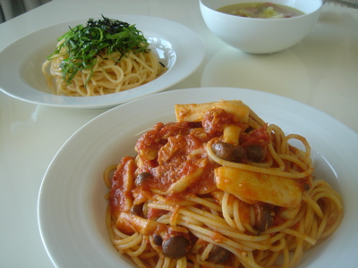 麺は半々にするつもりだったのにトマトソースの方にたくさん入れてしまって明太子スパは少量になってしまいました。トマトソースには何か入れ忘れてるような気がずっとしてましたが、食べて思い出しました。唐辛子!いれればもっと味がしまったなぁ。