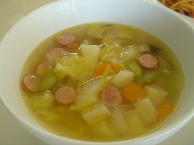 じゃがいも、人参、アスパラ、たまねぎ、キャベツ、ソーセージ、を小さく切って、炒めてコンソメと塩コショウで味付け。タイムを少々入れました。