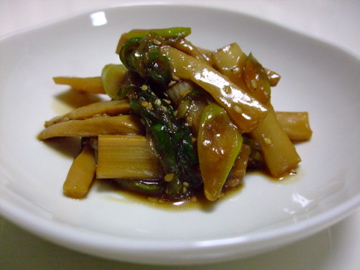 ごま油でネギのうすぎりをよぉく炒めたらメンマを投入。みりん、砂糖、しょうゆで味付けしてごまをふったらできあがり♪