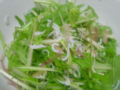 水菜のサラダですが、今回はみょうがと大葉、しらす干しをあわせてみました。