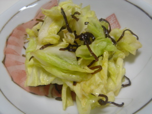 キャベツを適当な大きさに切って軽く塩揉みし、塩昆布とまぜあわせます。