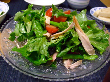 年末にまたまたスモークシャモが贈られてきたので、それを使ってサラダを作りました。スモークシャモ、アスパラ、ミニトマト、プリーツレタスをオリーブオイル、塩こしょう、ワインビネガーであえるだけ。