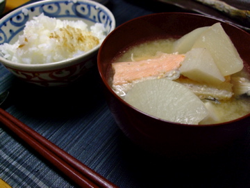 塩鮭のあらが50円で売っていたので、大根と里芋と一緒にガラ汁にしました。