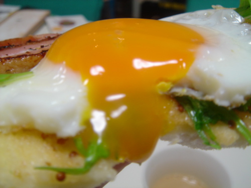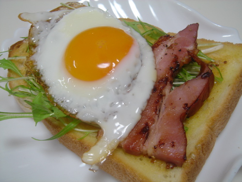 ④③のベーコンと目玉焼き(半熟)をのせて出来上がり♪