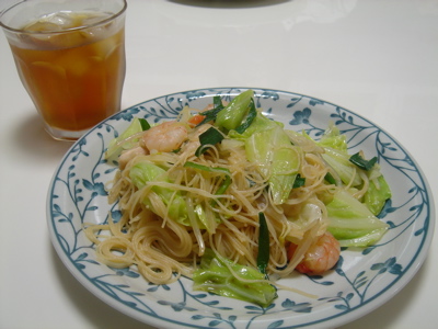 いつものケンミンの焼きビーフンに、具はエビ、鶏胸肉、きゃべつ、もやし、にら(冷蔵庫にあったもの)です。