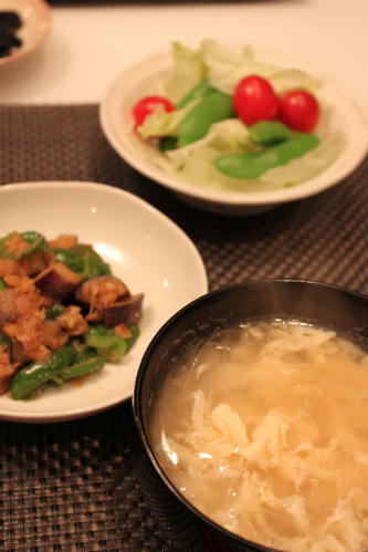 メニューは牛タン焼き、茄子とピーマンの味噌炒め、野菜サラダ、山芋の千切り、仙台長なす漬け、韓国風卵スープ、ごはんです。