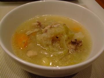 じゃがいも、にんじん、たまねぎ、キャベツなどが入っていますが、野菜の形が崩れてしまうほど煮込んであります。