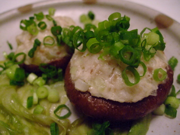 鶏挽肉、ねぎのみじんぎり、しょうが汁、酒、塩こしょう、卵、鶏ガラスープ、片栗粉を混ぜ合わせたものをいしづきを取ったしいたけのかさにのせて蒸したものです。椎茸がぷるぷるで美味しかった〜♪