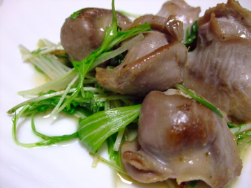 レシピ:砂肝を半分に切ってごま油で炒め、塩こしょうで味付けした後水菜を入れ、最後にリケンノンオイルドレッシング「青じそ ハーブ&レモン」をさっと加え、ざっと炒めてできあがり♪