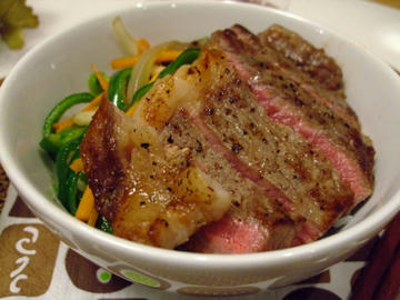 普段ステーキなんて焼かないから心配だったのですが、この焼き方を覚えたらもう大丈夫って思えました。うちも丼ものはほとんどしないのですが、他のブログでみかけて美味しそうだなと思ったのでやってみました。ちょうどお肉が安くなってたのが一番の理由ですけどね^^。ソースはまさに甘辛系のソースで相性ピッタリでしたよ。