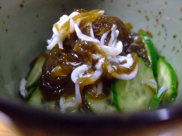 もずく酢。沖縄産の塩もずくをよく洗って、きゅうりの薄切り、釜揚げしらすと一緒に、酢、しょうゆ、みりんで味付けでできあがりです。