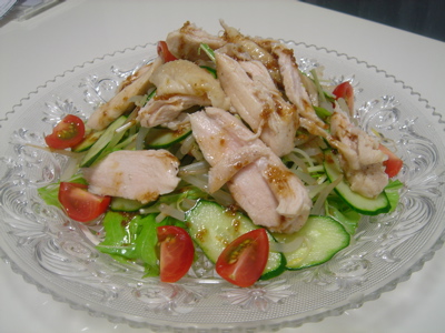 1)鶏胸肉は塩コショウ、酒をふってレンジで3分チンして適当な大きさにさいておく。