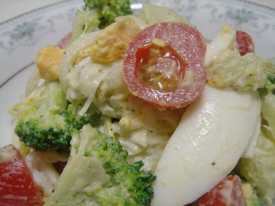 ②プチトマト(へたをとって半分にわる)、ゆでブロッコリー(小さめに切る)、ゆでたまご(縦に6分割)、たまねぎスライスをボウルに加え、塩コショウ、マヨネーズで味をととのえて出来上がり♪
