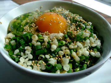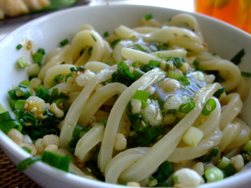 ゆであげた麺をそのまま器に盛り、すりおろしたしょうが、たっぷりのねぎ、揚げ玉、ごまをのせ、最後に生卵を落とします。いりこだしのつゆとお醤油を少しかけて七味唐辛子をふって、よぉく混ぜ合わせれば美味しい美味しい釜玉うどんのできあがりです♪(本来は卵は一番下に入れるそうなのですが、見た目を考慮して上にのせました。)