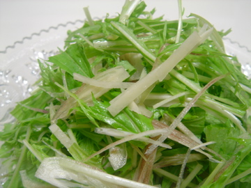 水菜、みょうが、新生姜の千切りをあえるだけ。醤油ドレッシング(サラダ油、しょうゆ、酢、塩、こしょう)を添えて。