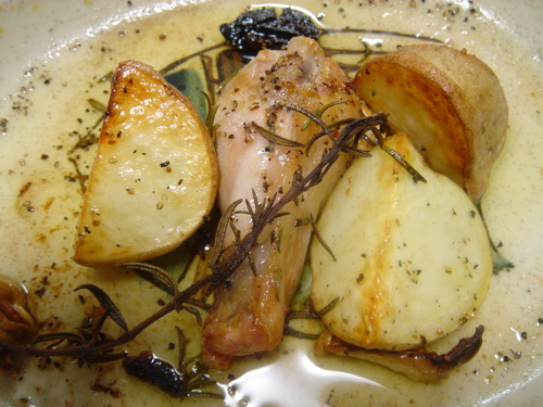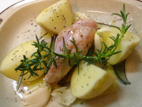 材料は鶏手羽元1本、新ジャガ1個、にんにく2こ、ローズマリー適量。