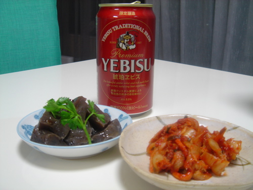 焼く間、琥珀エビス最後の一本を飲みながら待ちました。