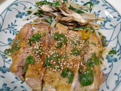 ⑤焼けたら食べやすい大きさに切って、ごま油、しょうゆ、みりん、大葉のみじん切りをまぜたたれをかけ、いりごま、コショウをふってできあがり♪