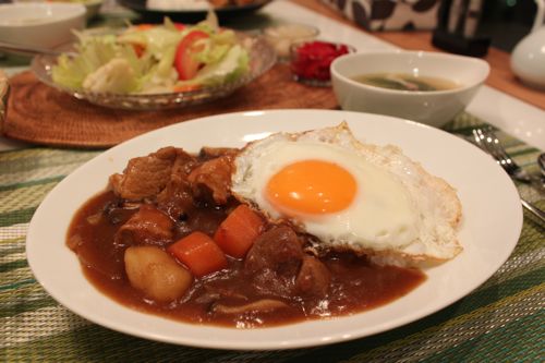わが家ではごろごろ野菜の入った普通のカレーはあまり作りません。きのこカレーとかなすとひき肉のカレーとかを作ることが多いんです。でもたまにはこういうカレーライスもいいですね。