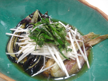 茄子、しめじ、みょうがを素揚げして麺つゆにつけて、冷ましたら白髪ねぎと大葉の千切りを飾ってできあがりです。