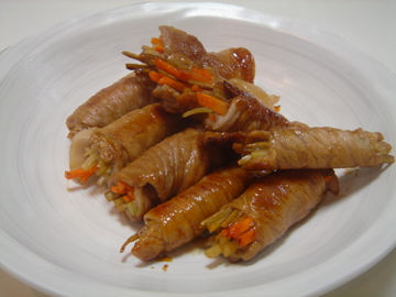 1)ごぼう、にんじん、セロリを千切りにして塩こしょうした豚肉でくるくるっと巻く。