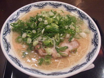一口スープをいただくと、こってりかとおもいきや意外とあっさりとした食べやすい味です。麺はストレートでこれぞ、博多ラーメンという雰囲気。具はチャーシュー、メンマ、ねぎとシンプルです。写真は彼のオーダーしたものでねぎが多めになっています。この青いねぎと白いスープがいいですよね〜