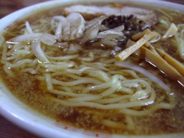 麺は柔らかめ、スープは深みのある醤油味。表面には油の層ができています。