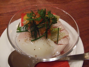 右は「じゃがいもの冷製スープ」。ちらばっているのは細ーく切って揚げたジャガイモでした。口当たりがちょっと変わってておいしかったです。