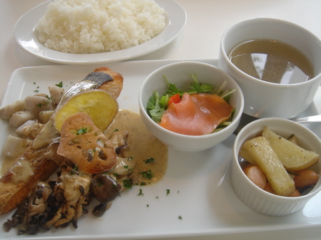 付け合わせはサーモン入りのサラダ(ドレッシングはかかっていませんでした。サーモンの塩気で食べろってこと?かけ忘れ??)、じゃがいもとソーセージのローズマリー風(ジャーマンポテトかな?)、しいたけと卵のスープ。