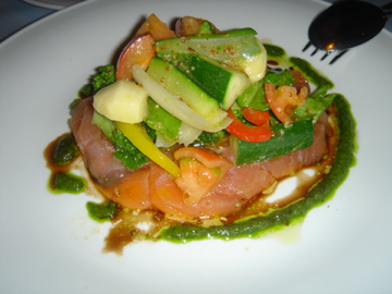 左は冷たい前菜の「自家製厚切りスモークサーモンの野菜のヴィネグレット添え」