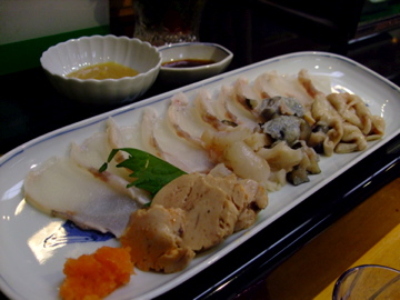 お刺身、あん肝、胃袋、皮、卵。ポン酢や酢みそでいただきます。