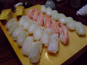 握りは手前からギッチョ(たまがんぞう、ヒラメの仲間?)、ヒラメ、ズワイガニ、やりいか。