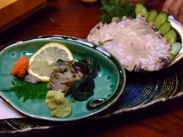 このキモをどうしても食べたかったというお客様のリクエストでアワビのお刺身。