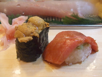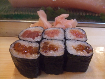大トロ、うに、蒸し車エビ、中トロ、いか、ぶり、穴子、玉子、巻物はすじこと鉄火。これにお椀がついて3500円です。値上がりしたかな??