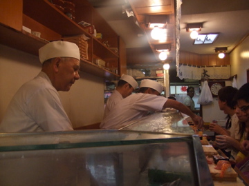 写真手前が大将です。「おいしいよ〜。いっぱい待ったね〜」などといいながら次々と握りたての江戸前寿司を出してくれます。