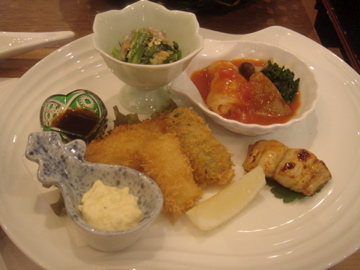 上からエビの大葉巻き、しょうが、栗、カマス、くるみあんのかかった何か(忘れました)、牛肉チーズ、アスパラ。