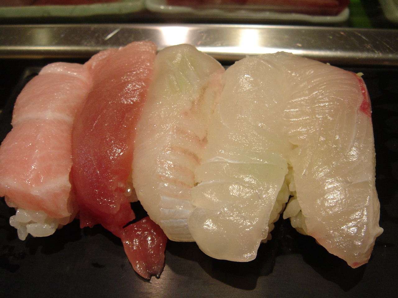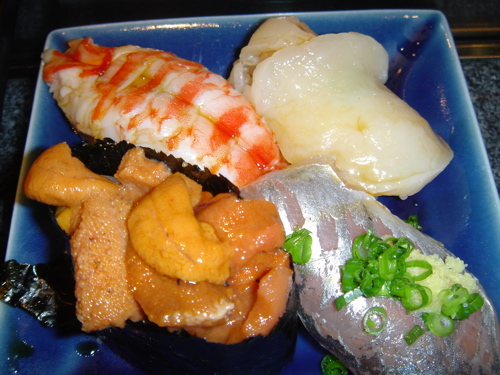 まずは白身と中トロ、大トロ。アジ、帆立、うに、車エビ。